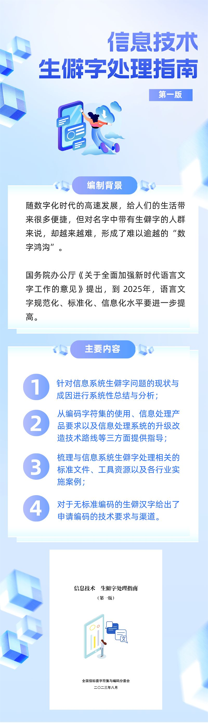 为贯彻落实国务院办公厅《关于全面加强新时代语言文字工作的意见》的指示精神,推动各行业遵循统一编码标准,切实解决信息系统生僻字问题,全国信息技术标准化技术委员会字符集与编码分技术委员会牵头组织起草了《信息技术 生僻字处理指南》文件,经过公开征求意见,编写组对文件技术内容进一步完善形成《信息技术 生僻字处理指南》(第一版)终稿于本月正式发布。