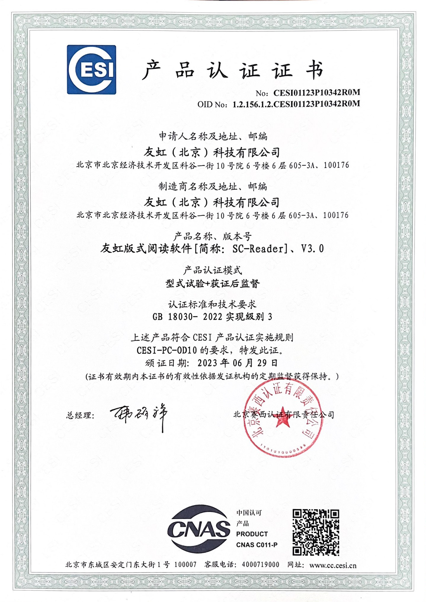 会上,友虹版式阅读软件SC-Reader作为首批通过GB 18030-2022标准认证和符合性测试的办公软件产品,被授予了认证证书及荣誉证书。同时,会议向社会各界报告了当前各类产品及厂商对标准的支持情况,公布了首批通过GB 18030-2022认证的产品共74款,以及首批通过标准符合性测试的产品共149款。