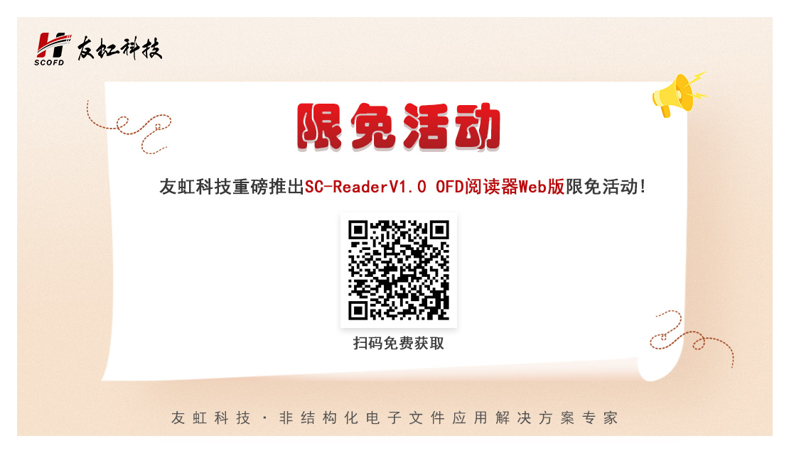 为庆祝第五届数字中国建设峰会及电子文件创新应用论坛的圆满召开,友虹科技特推出SC-ReaderV1.0 OFD阅读器Web版限免活动。本活动期间,产品永久License可通过扫描下方二维码获取!
