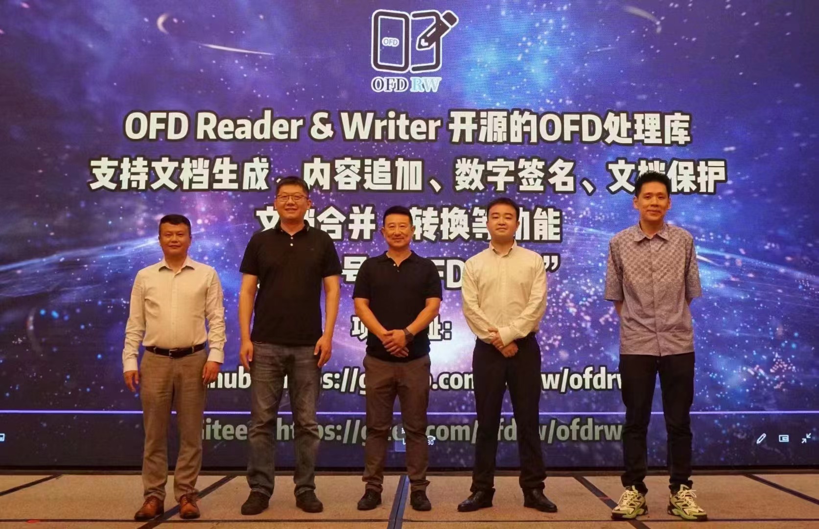 友虹科技董事长徐志东先生作为联盟基础技术组代表受邀上台,携点聚科技总经理孙高健先生、艾卡维特总裁黎泽嘉先生、数科网维总裁王少康先生、博思软件总裁助理陈靓先生共同宣告OFD-RW社区正式上线,见证历史性时刻。OFD-RW社区作为国内首个开源OFD社区,未来将推动OFD基础技术开源的高速发展,满足广大开发者的技术需求。