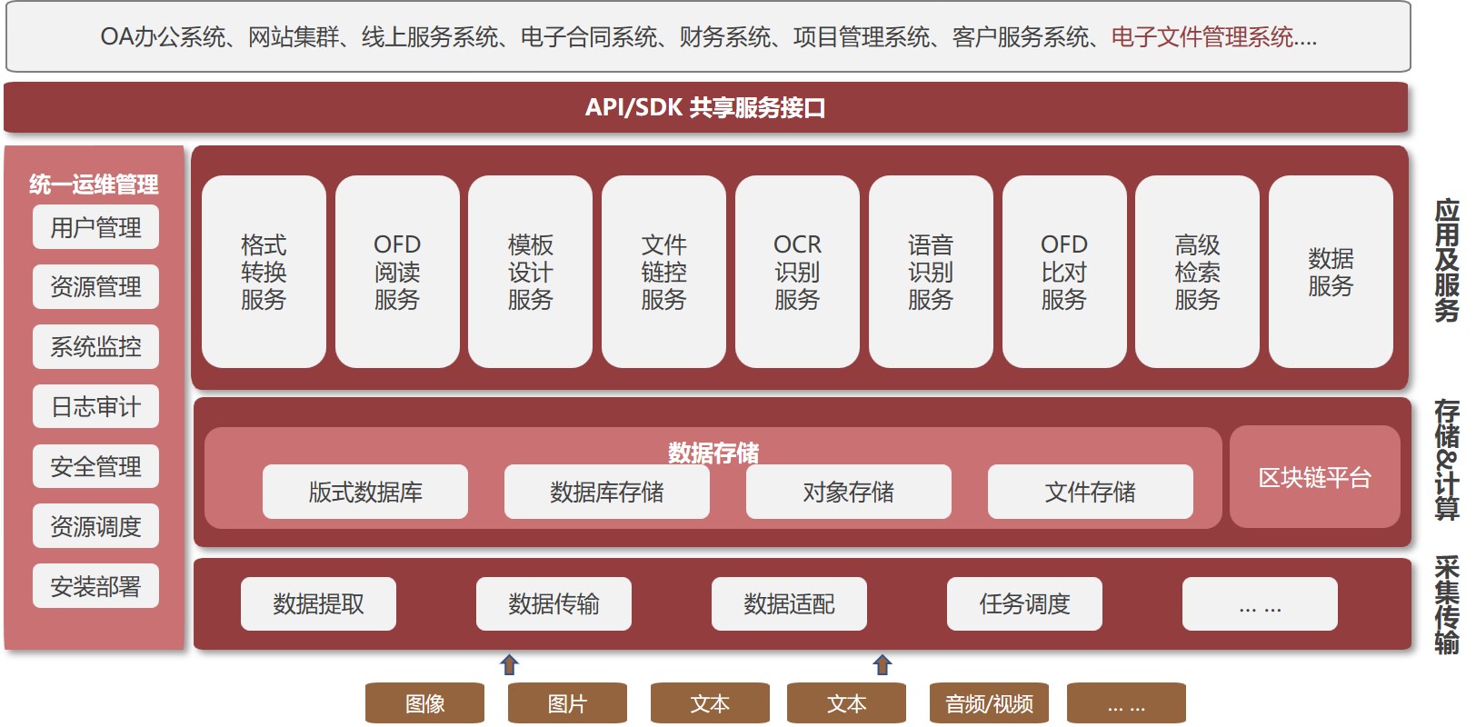 友虹科技基于OFD版式标准,研发并推出了一体化文档中台解决方案,帮助用户的业务系统快速具有与OFD版式技术相关的核心服务能力。文档中台覆盖了OFD版式文档生成、转换、处理、阅读、管控、存储等版式文档的全生命周期各个环节;用户业务系统通过调用平台提供的开放API函数接口,可以便捷的服务于用户,解决用户在使用OFD版式文档中遇到的各种问题。同时,文档中台也可以独立使用,用于支撑电子文件的统一管理、多级分享、细粒度授权、跟踪防伪、外放利用等场景。