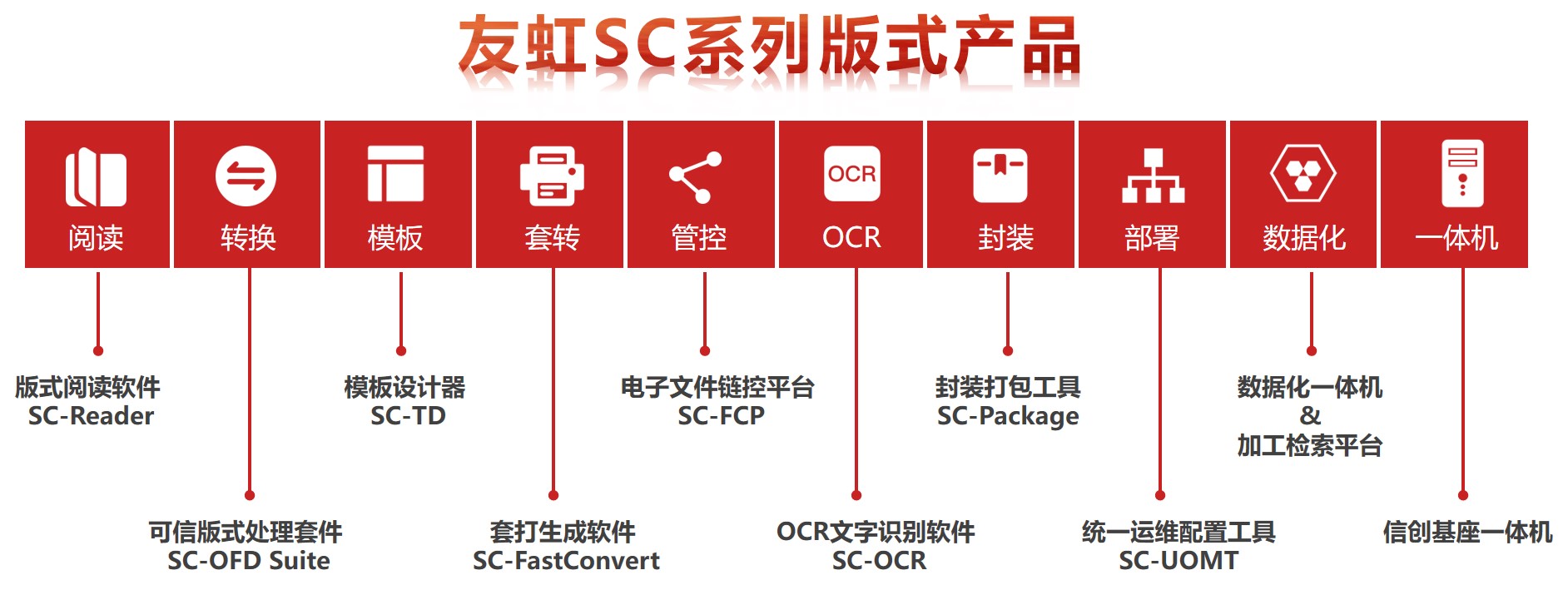 友虹科技作为国内领先的基础软件与平台服务提供商,始终致力于推动国产自主知识产权技术及基础软件产品的发展与创新。友虹以非结构化电子文件为主线,构建了生态完整的友虹SC版式系列产品线,涵盖了版式阅读器、高并发文件加工转换处理平台、模板设计器、电子文件管控平台、信创基座文档数据化一体机等多种产品,覆盖了从阅读、生成、处理、分享、管控到存储利用的电子文件全生命周期各个关键节点