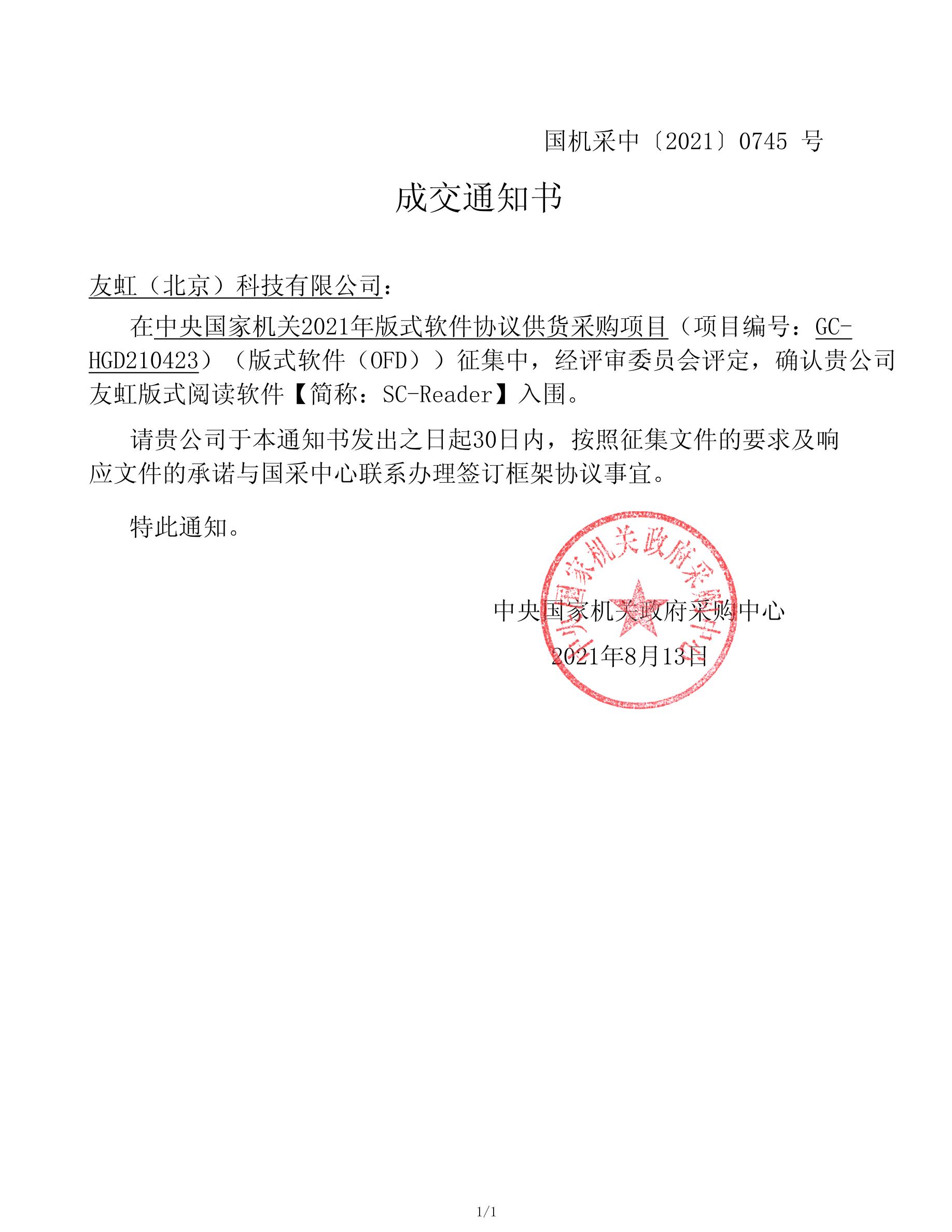 2021年8月16日,中央国家机关2021年版式软件协议供货采购项目(GC-HGD210423)成交公告发布。本次采购项目征集内容分为两包,第一包为版式软件(OFD),第二包为版式软件(PDF)。友虹科技以排名第二的评审总分成绩,成功入围第一包版式软件(OFD)!